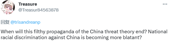 网友@Treasure问道,这种“中国威胁论”的肮脏宣传什么时候才能结束?为什么这种对中国的种族歧视越来越明目张胆?