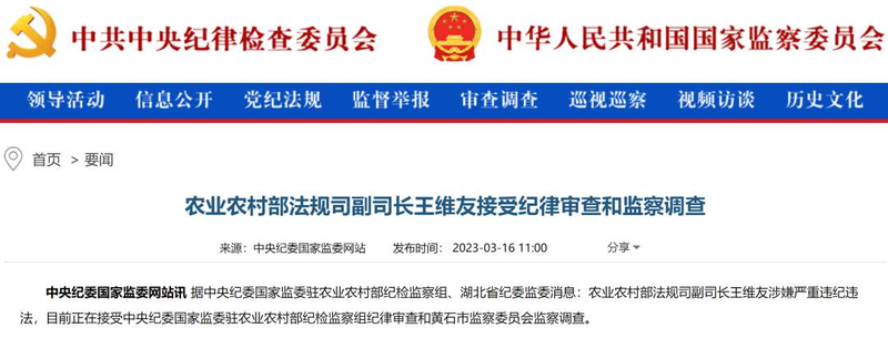 据中央纪委国家监委驻农业农村部纪检监察组、湖北省纪委监委消息:农业农村部法规司副司长王维友涉嫌严重违纪违法,目前正在接受中央纪委国家监委驻农业农村部纪检监察组纪律审查和黄石市监察委员会监察调查。