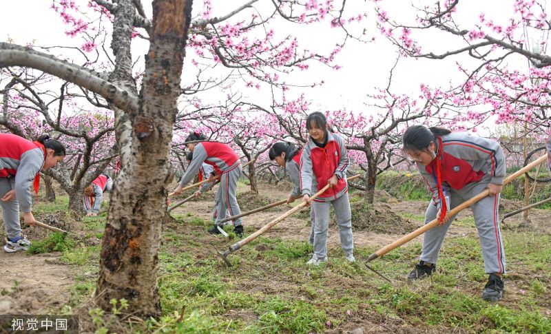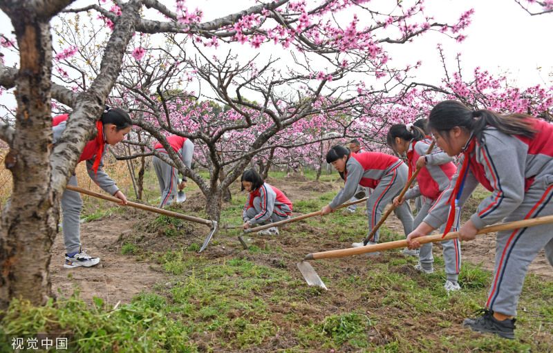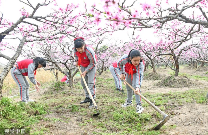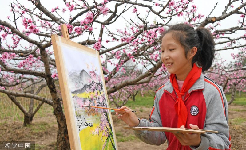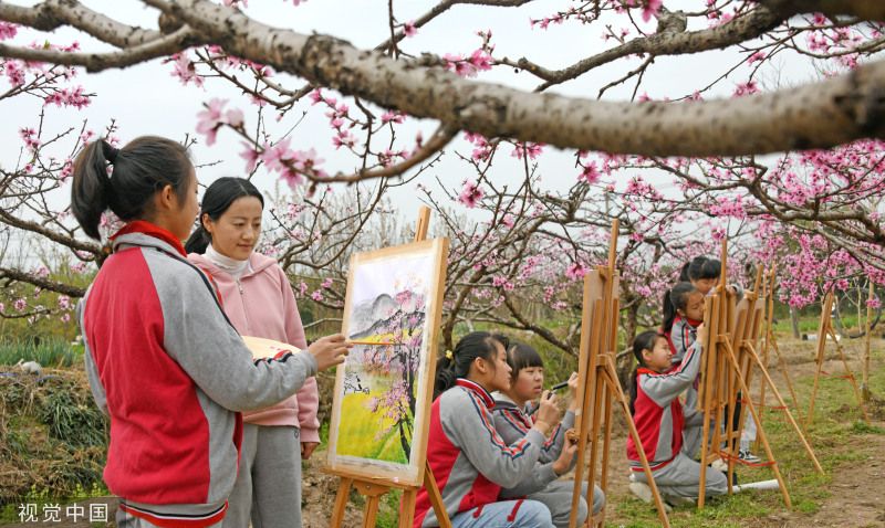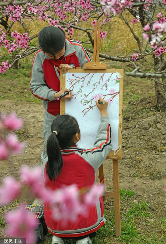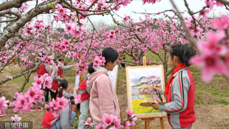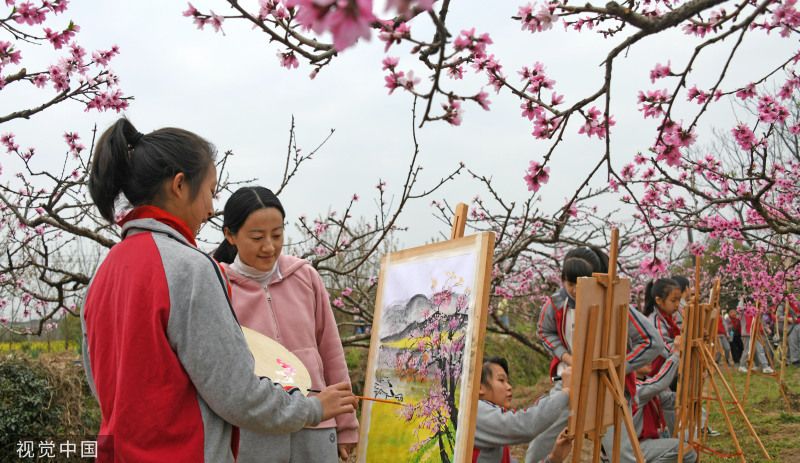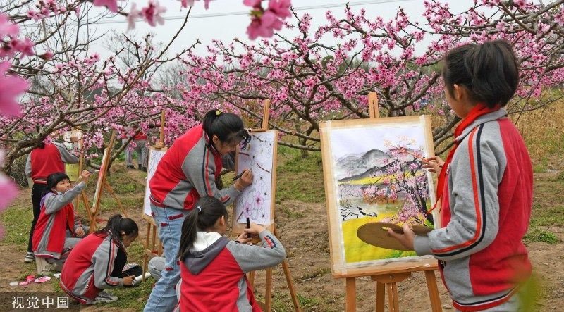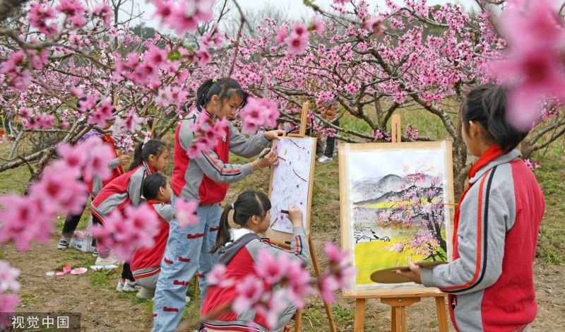 2023年3月17日,浙江台州,仙居县下各镇中心小学美术兴趣小组的学生在桃花园内写生。