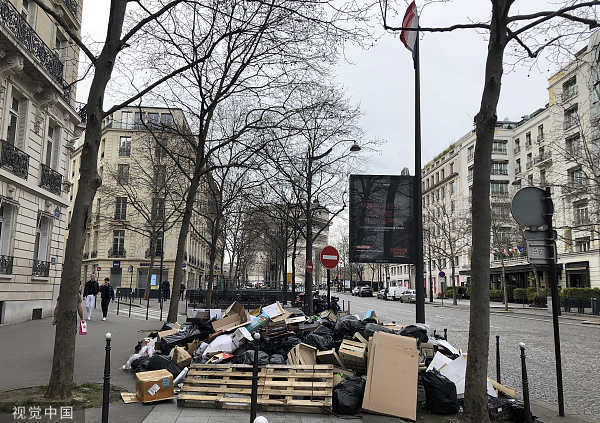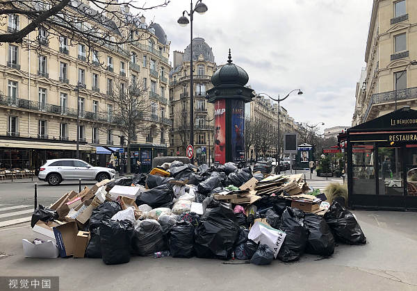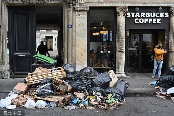 当地时间2023年3月17日,法国巴黎,市中心无人清理的垃圾。巴黎市政府称,巴黎待清理的垃圾当天已达万吨。成堆的垃圾几乎随处可见。 中新社记者 李洋 摄