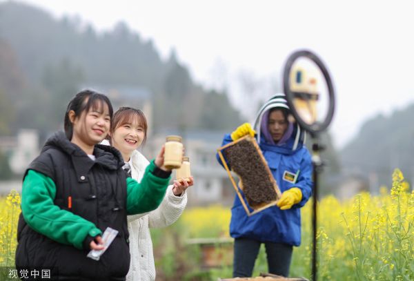 2023年3月18日,贵州黔东南,岑巩县羊桥乡坪地村,驻村干部在直播助农销售蜂蜜。