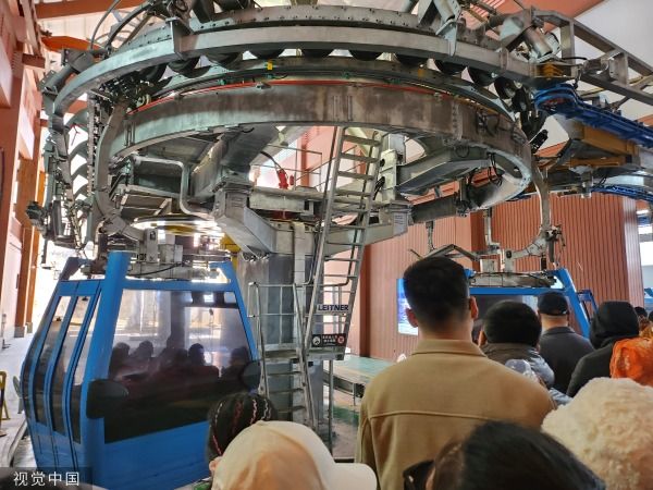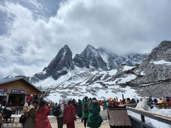 2023年3月19日,云南丽江,玉龙雪山迎客流高峰,游客排长队乘坐索道。