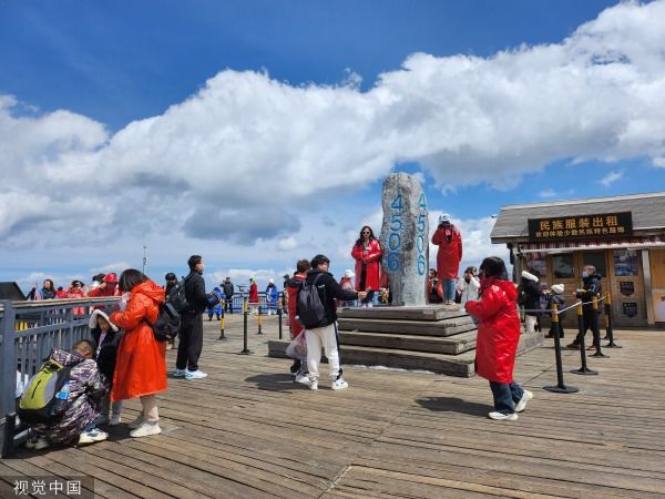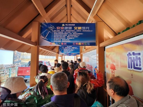 玉龙雪山迎客流高峰 游客排长队乘坐索道