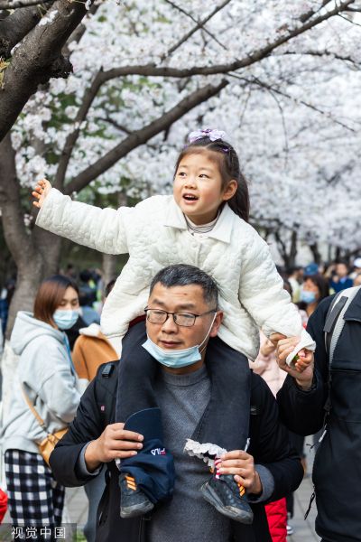 2023年3月18日,南京市,市民来到位于玄武区的鸡鸣寺路观赏樱花,欢度周末假期。