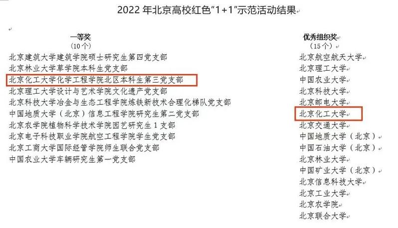 在刚刚公布的2022年北京高校红色“1+1”示范活动获奖名单中,我校化学工程学院北区本科生第三党支部从北京市50所高校的1204个党支部中脱颖而出,最终获评2022年北京高校红色“1+1”示范活动一等奖,我校荣获优秀组织奖。这也是我校连续第十一年荣获该项目的以上两个奖项。