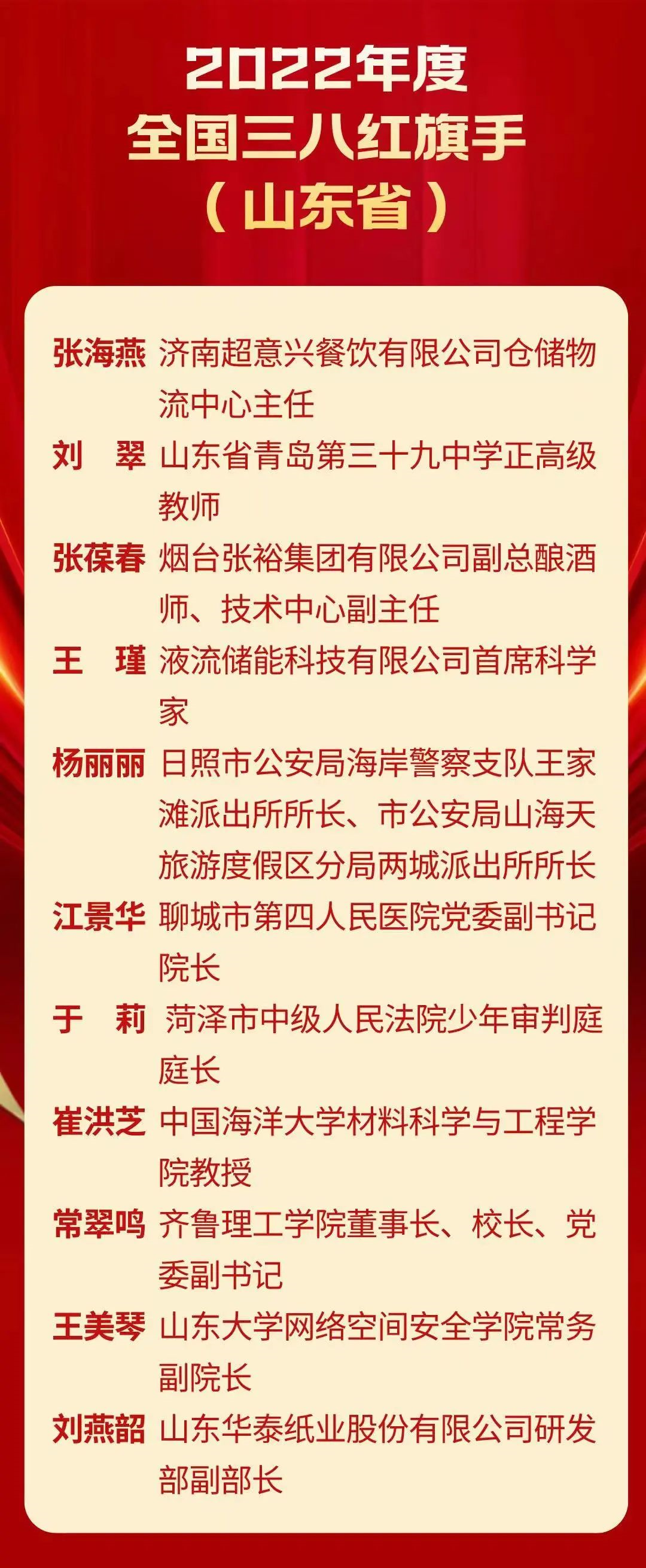 根据分学院和地方校友会反馈,目前已知校友张葆春同时获得“全国三八红旗手”“齐鲁女性杰出人物”两项殊荣!巾帼不让须眉!下面,让我们一起走进“她”的故事。