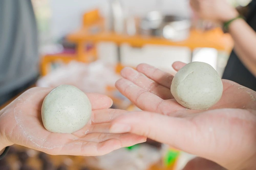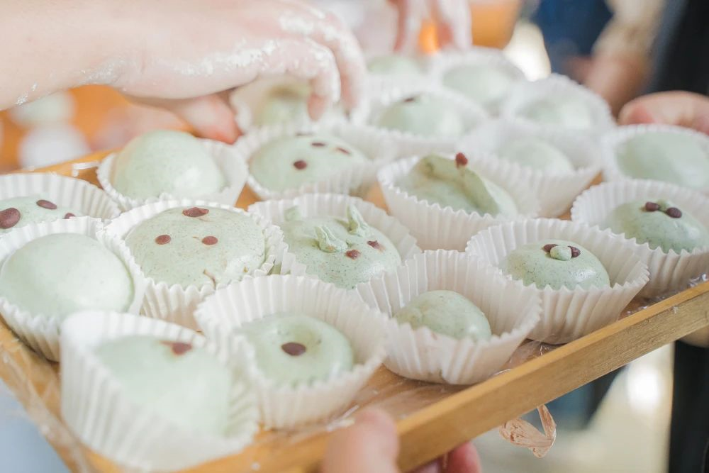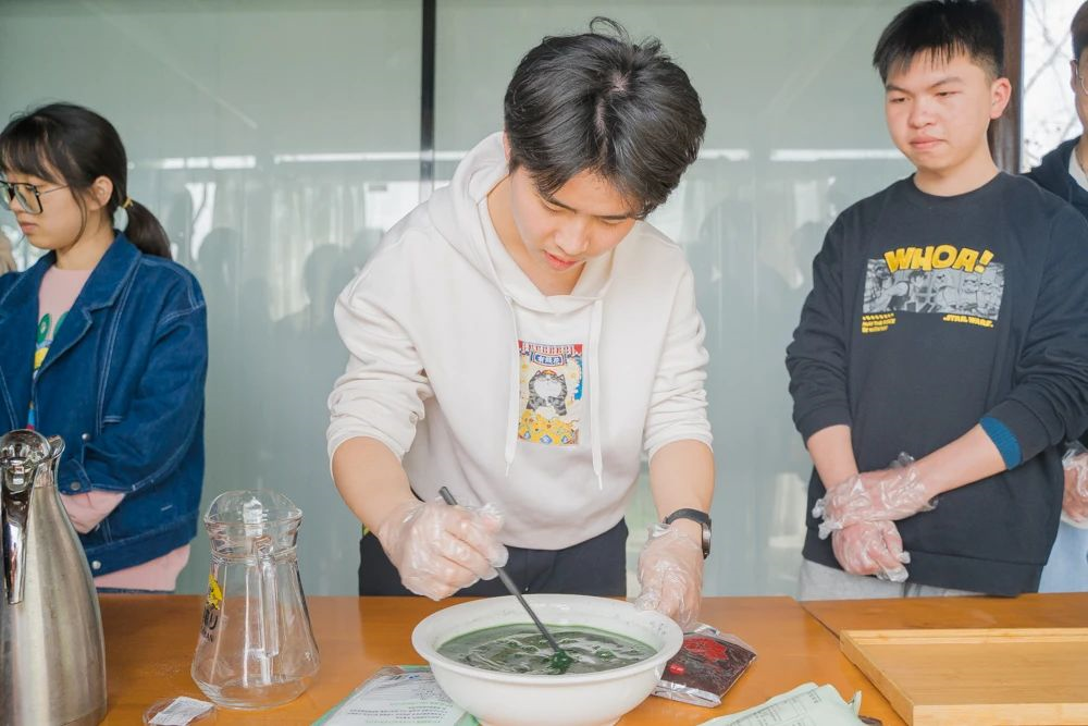 师生还一起动手做了青团。雪白的糯米粉和清香的艾草汁在同学们的“巧手”中慢慢从小面团到碗状胚子,再到包上豆沙馅料,搓成圆滚滚的团子,青团渐渐成型。当香喷喷的青团上桌后,同学们满怀期待地品尝着自己的劳动成果。