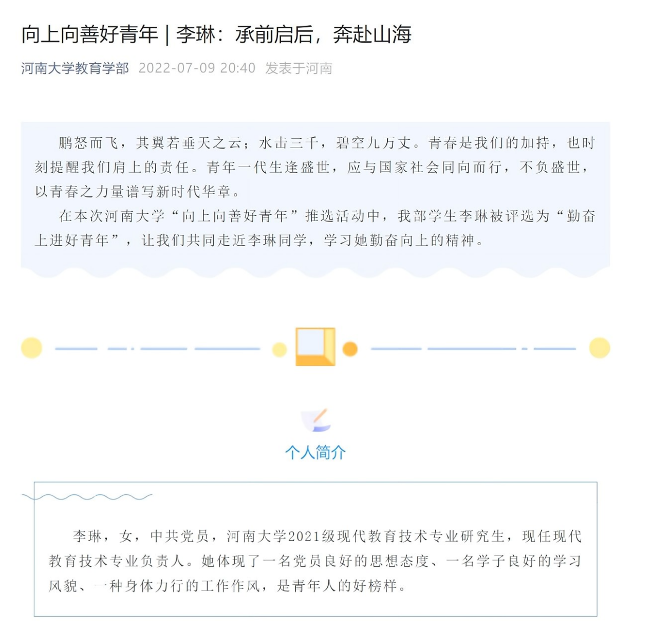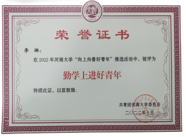 河南大学教育学部坚持培养创新性研究型人才,给学生提供了许多学习与交流的机会,让李琳有机会在各种学术活动中锻炼自我、提升自我、展现自我。而李琳也不负期望,获得了诸多的成就。