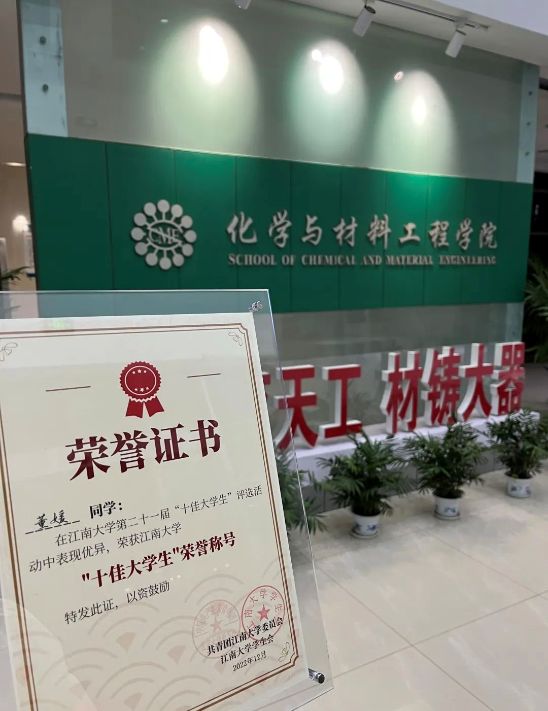 董媛与化学的初相见始于初中,一个个化学元素构成了千变万化的化学世界,梦想之种悄然播下。念念不忘,终有回响,经历了“千军万马过独木桥”的高考,她满怀希望与憧憬,来到江南大学化学与材料工程学院,开启了人生新的征程,在笃学尚行中彰显青春本色。