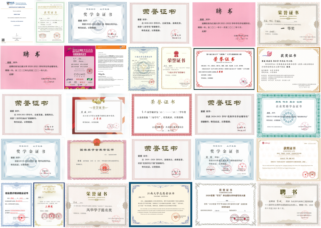 董媛,女,汉族,2002年3月生,中共党员,江南大学化学与材料工程学院高分子材料与工程专业2019级本科生。GPA 3.83,57门课程满绩,综合测评连续三年班级第一,推免总排名专业第一,保研至浙江大学。担任学院党务中心副主任、青年志愿者协会部长和学业辅导员,曾获国家奖学金、江苏省三好学生、江南大学第二十一届“十佳大学生”等29项荣誉奖项。作为项目负责人主持一项国家级大创项目,获得全国高分子材料创新创业大赛银奖。疫情时期主动报名防疫志愿者,累计服务同学上万人次,志愿服务时长超过140小时。