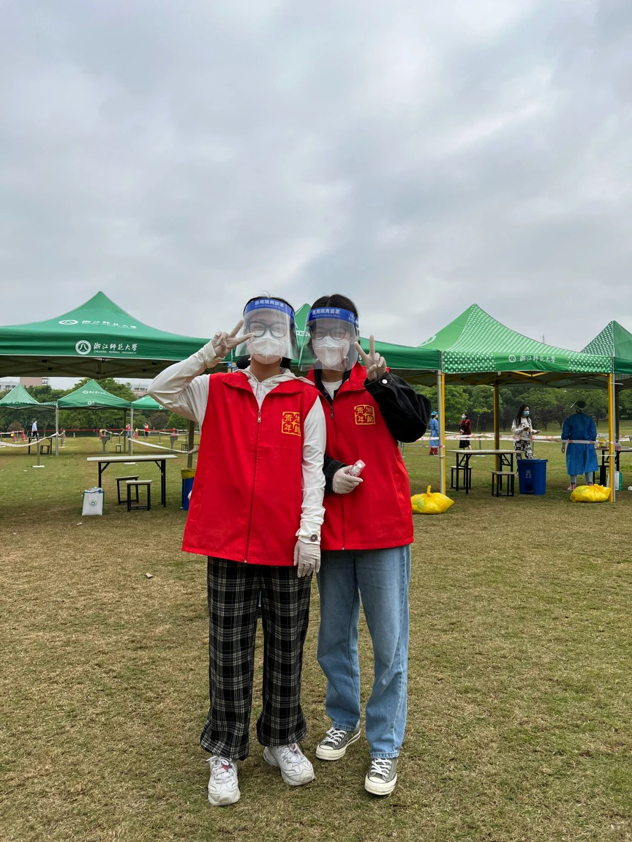 邹庆庆(右一)担任浙师大核酸检测志愿者