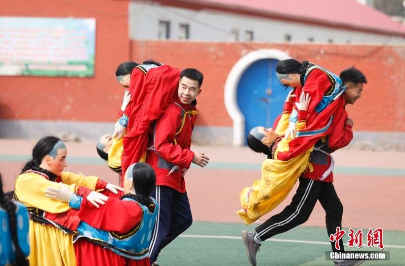 3月20日,河北省承德市隆化县职教中心学生练习中幡。近年来,河北省隆化县积极开展“非遗进校园”活动,将国家级非物质文化遗产“二贵摔跤”等特色非遗项目引入课堂,定期邀请非遗传承人走进校园,进行传统文化授课和培训,使学生亲身感受非物质文化遗产的无穷魅力和特有的文化价值,让传统文化薪火相传。