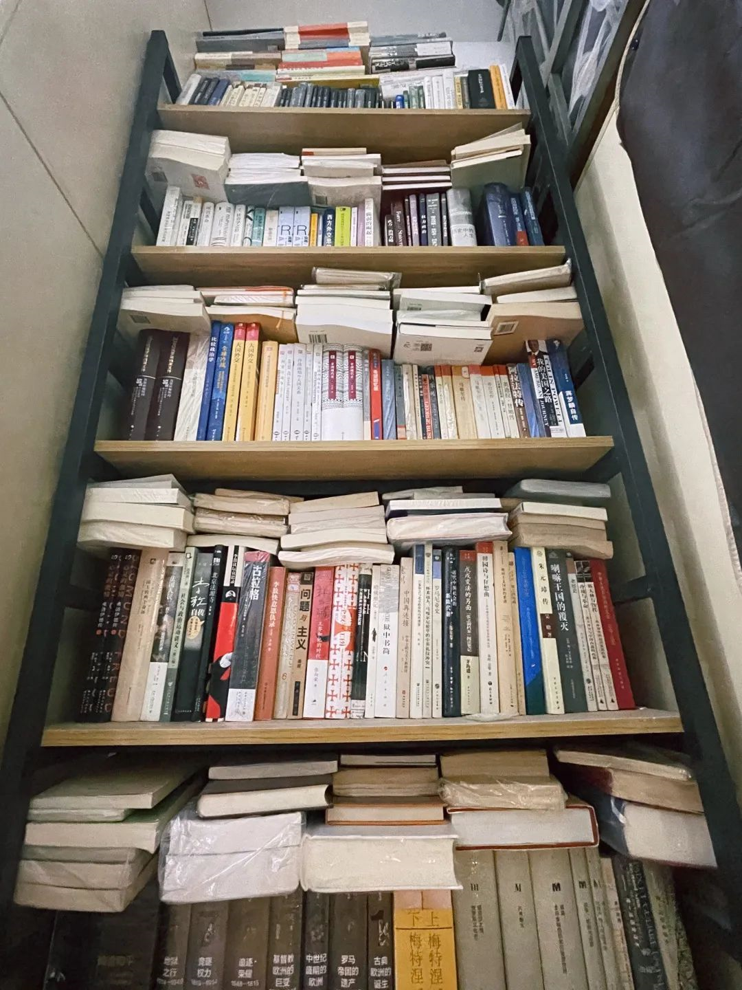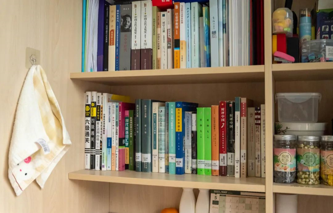 走进334宿舍,最引人注目的是书、书、书。政治学、经济学、历史学、哲学、心理学乃至科学通识读本,古今中外,天南海北,应有尽有。 宿舍里 共有两个独立书架,还有十只装满书的箱子。