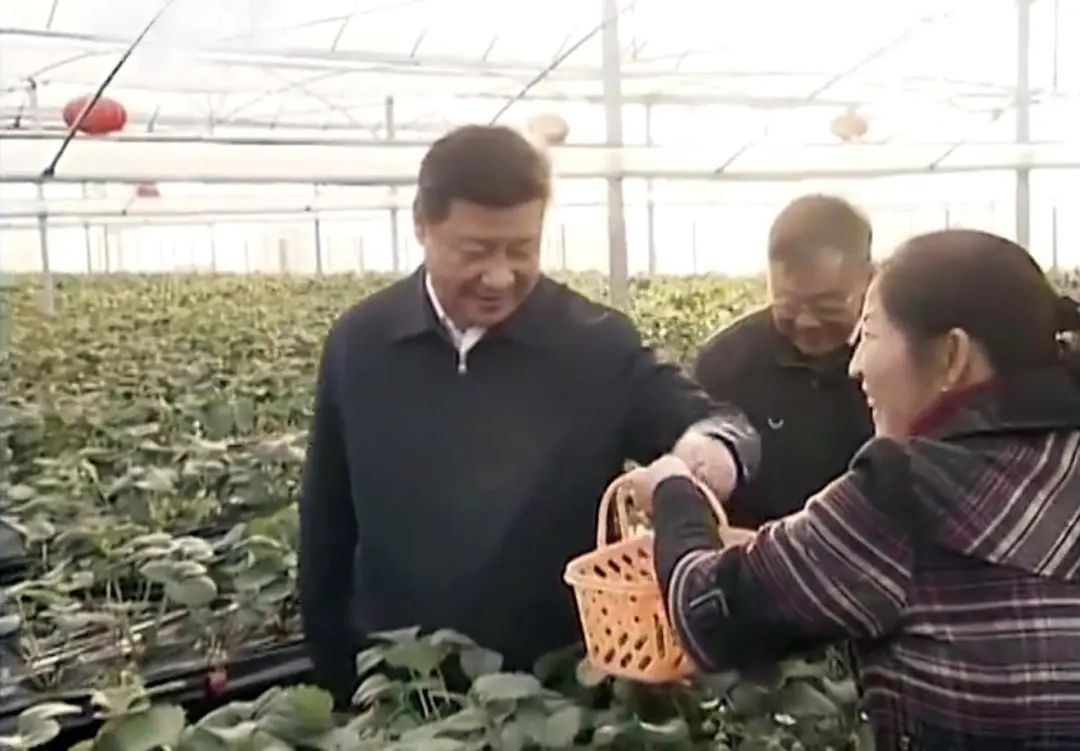 2014年12月13日,习近平总书记在江苏镇江市世业镇先锋村农业园草莓大棚,实地察看草莓生长情况。