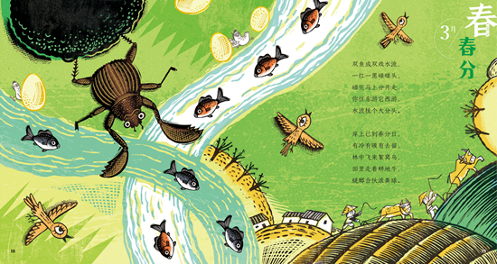 《二十四节气儿歌》如是书写“春分”:“双鱼成双戏水流,一红一黑碰碰头,碰完马上分开走,你往东游它西游,水波梳个大分头。岸上已到春分日,有冷有暖又去留,林中飞来絮窝鸟,田里走着耕地牛,蜣螂合伙滚粪球。”