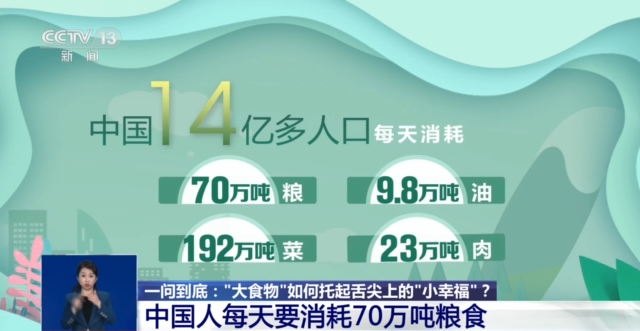 中国农业科学院研究员 国家食物与营养咨询委员会主任 陈萌山:过去我们吃饭,主要是主粮,一大碗米饭或者一点咸菜,一点辣椒。那么现在不一样了,我们一小碗米饭很多菜,不仅仅是主食,副食老百姓要求更高。我们讲直接消费的口粮,已经由1978年的人均248公斤,下降到目前的130公斤,所以副食也成为主食了。为了适应这样一个新的形势,总书记提出“大食物观”。