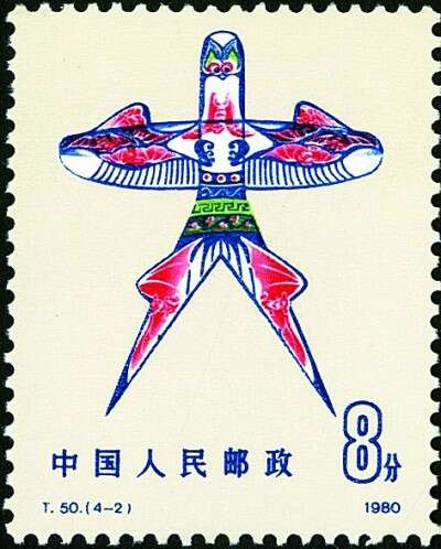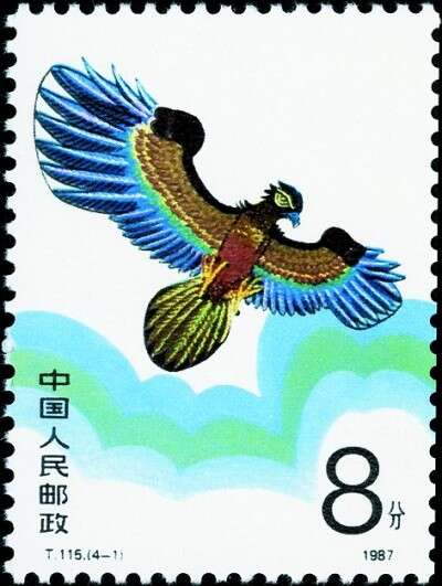 1987年4月1日面世的第二组《风筝》邮票全套仍为4枚,是为当年在山东潍坊举行的“国际风筝节”而发行的。第1枚是“鹰”(图④),描绘象征勇猛和力量的鹰形风筝长空展翅,栩栩如生;第2枚是“龙头蜈蚣”(图⑤),展示由张着巨嘴的龙头与蜈蚣状身体连成一体的风筝腾空飞翔,气势磅礴;第3枚是“八卦”,呈现按阴阳八卦图形分布的风筝凌空翱翔;第4枚是“凤凰”,百鸟之王翩翩起舞,美丽吉祥。
