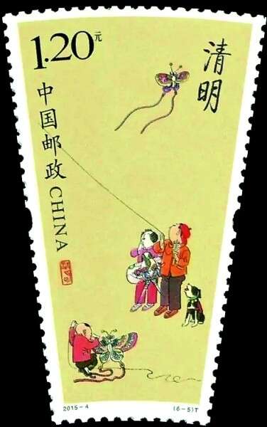 2010年4月5日发行的一套3枚《清明节》邮票中的第2枚“踏青”,描绘5名儿童在蓝天白云下的芳草地放风筝的情景。另一枚以清明节放风筝为题材的邮票是2015年2月4日面世的一套6枚《二十四节气(一)》邮票中的第5枚“清明”(图⑥),票型采用扇形,以国画小品形式描绘一家三口带着小狗在户外放风筝的场面,人物造型憨态可掬,具有较强的艺术感染力。