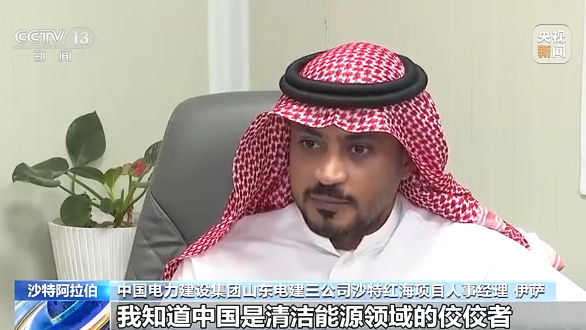 中国电力建设集团山东电建三公司沙特红海项目人事经理 伊萨:我知道中国是清洁能源领域的佼佼者,拥有强大的能力,引领着全球的发展。而且中国还是风力涡轮机和光伏板的最大生产国,中国的丰富经验在沙特这样广阔的土地上施展开来,才让红海新城这样的梦想有变成现实的可能性。