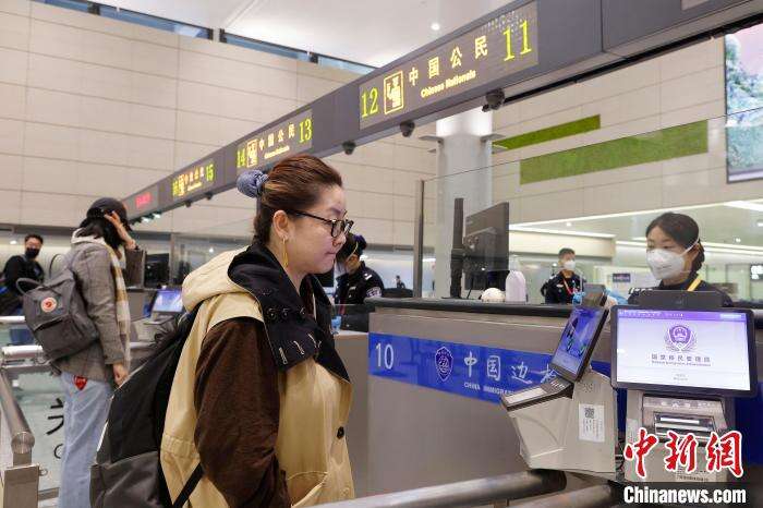 虹桥边检站民警在对出境旅客进行信息核查。 殷立勤 摄