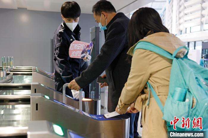 安检工作人员在虹桥机场T1航站楼内帮助旅客顺利验证。 殷立勤 摄