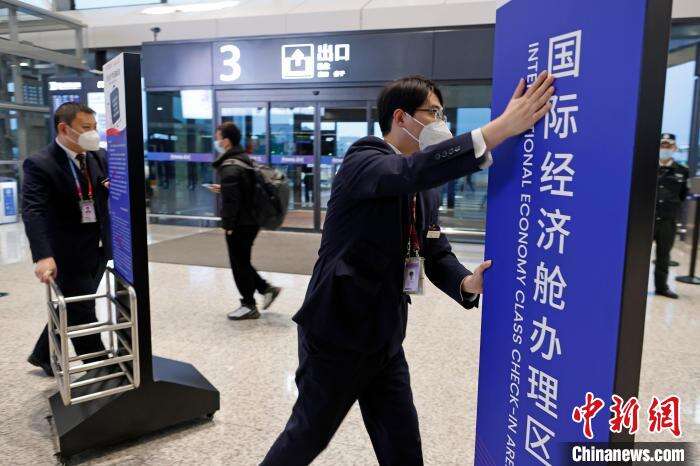 东航工作人员在虹桥机场T1航站楼内进行引导牌摆放。 殷立勤 摄