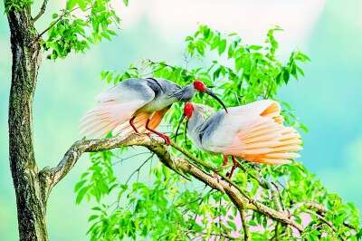 朱鹮在枝头嬉戏,构成一幅自然和谐的田园美景。秦显礼摄