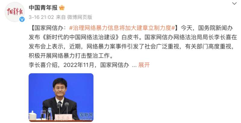 3月16日,国家互联网信息办公室网络法治局局长李长喜表示,近期,网络暴力案事件引发了社会广泛重视。