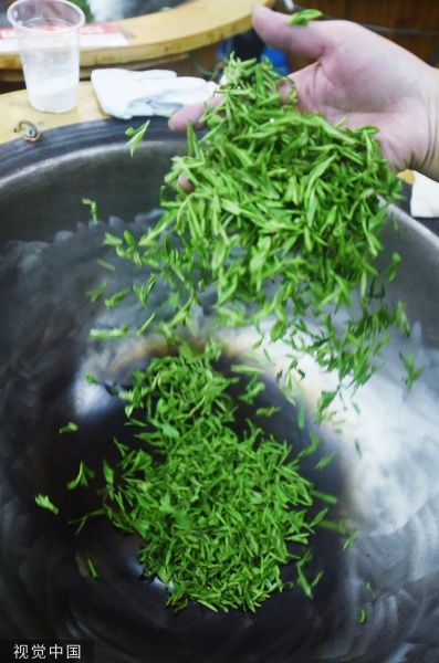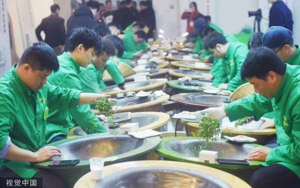 2023年3月25日,杭州,在2023西湖龙井茶炒茶王大赛上,西湖区各村的炒茶高手手工炒制西湖龙井明前茶。