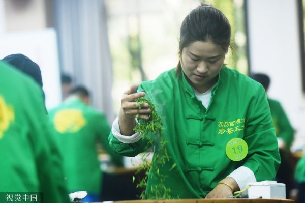 当日,2023西湖龙井茶炒茶王大赛在杭州西湖区龙坞茶镇举行,来自西湖区各村的40多名炒茶高手现场展开西湖龙井茶明前茶的纯手工炒制技艺比拼,争夺“2023西湖龙井炒茶王”称号。