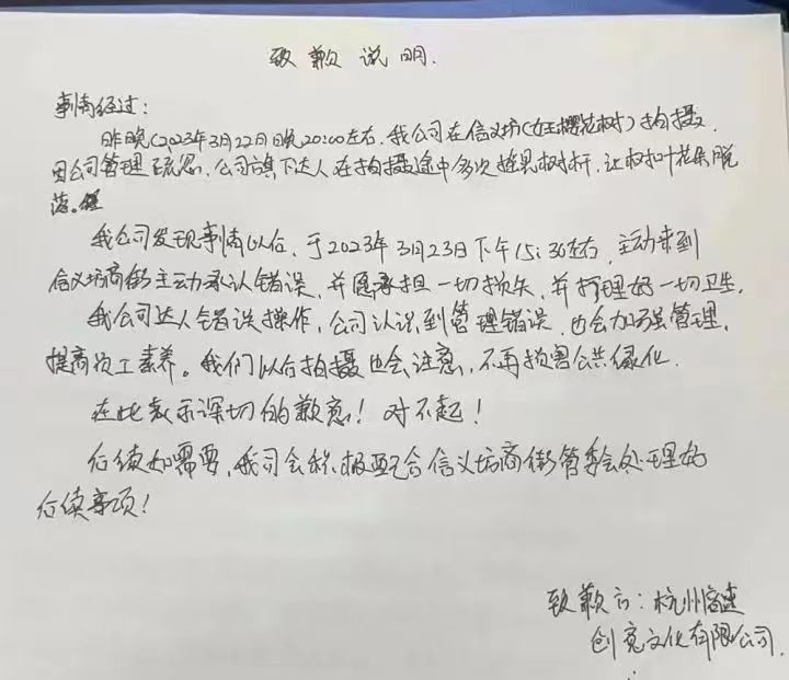 据了解,在此事发生的第二天下午,该网红团队所在公司来到信义坊商街主动承认错误,并打理好一切清洁工作。这家公司在给信义坊商街管委会的手写致歉信中称,公司认识到管理错误,以后会加强管理,提高员工素养,针对此次事件,愿承担一切损失,不再损害公共绿化。
