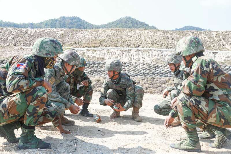 烈日下的实爆作业场,地表温度超过40℃。双方采取理论讲解、操作演示、互教互学等方式,以某型便携式激光销毁未爆弹装置为例展开学习交流。现场分区明确、指挥有序、警戒到位,中柬两军官兵按照演练编组逐一过的方式,在安全员带领下完成火药、火具请领及点火管制作等步骤,在指挥员指令下完成点火爆破。伴随着一阵阵爆炸声,现场尘土飞扬。