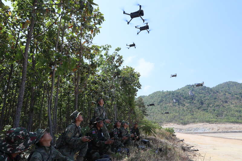 3月28日,中柬参演官兵组成的情报侦察小组放飞编组无人机蜂群,配合其他侦察手段,对任务目标实施抵近侦察。高毅/摄