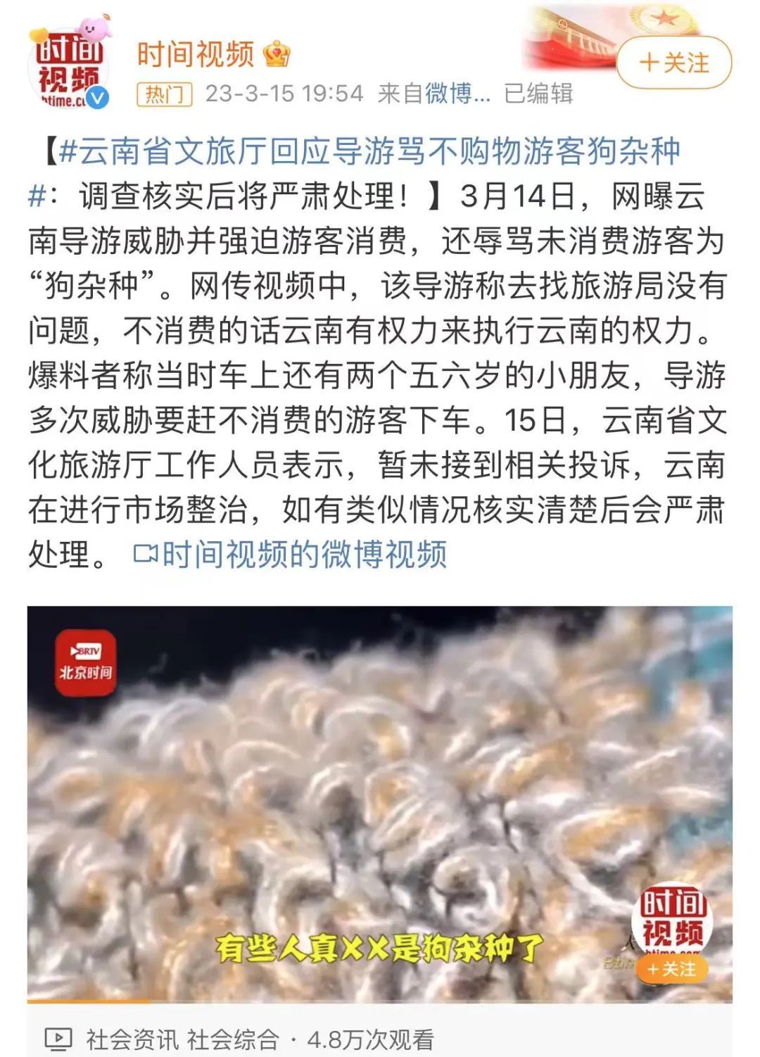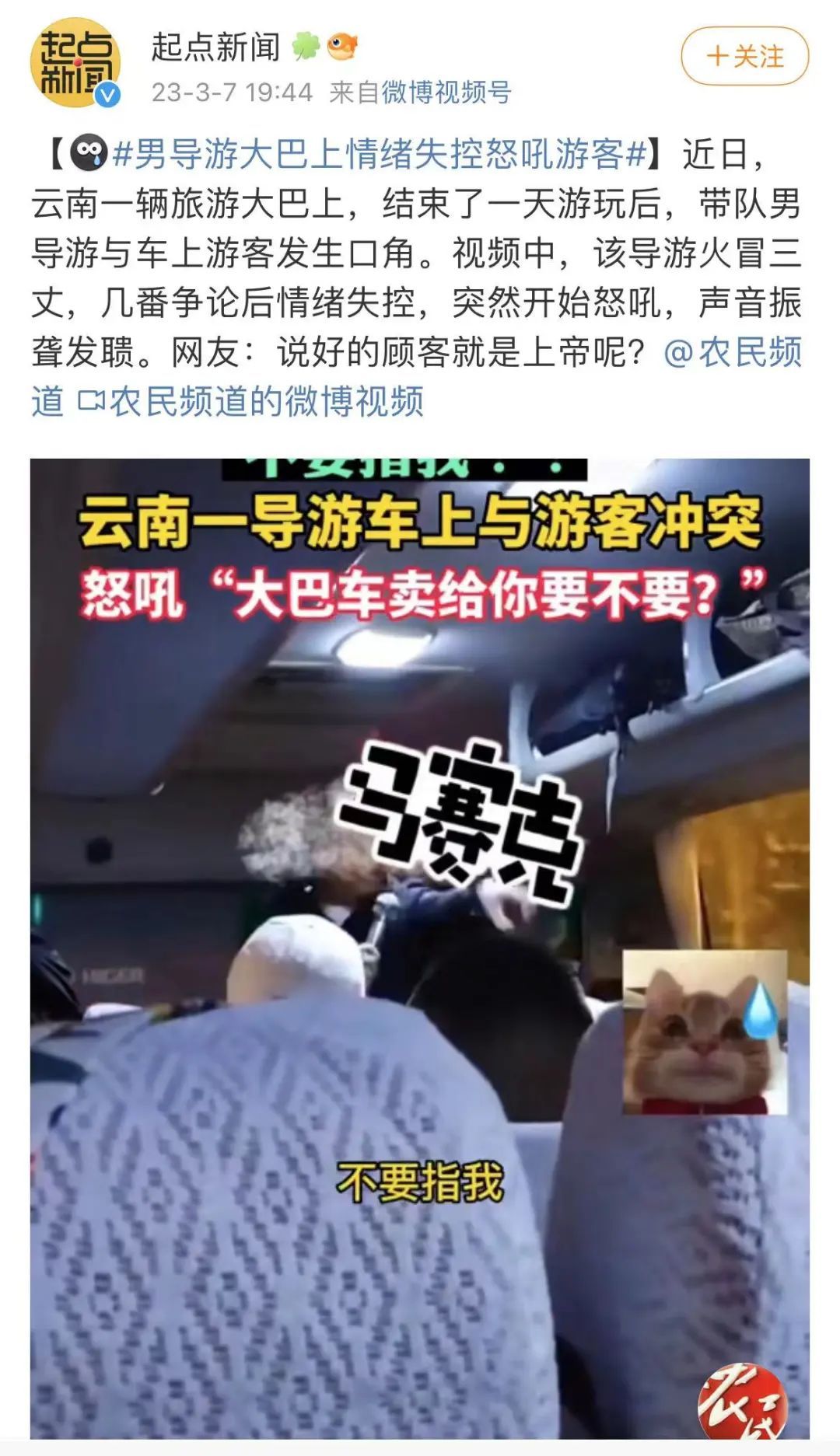 中国青年报注意到,3月初,有网友发布视频称,云南一名带团导游在大巴车上与游客发生口角并怒吼游客,引发关注。