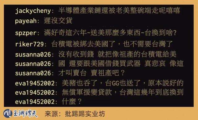 在“批踢踢实业坊”讨论美国军援的帖子中,谭主注意到,有另一个词被频繁提起:“祖产”,台积电。