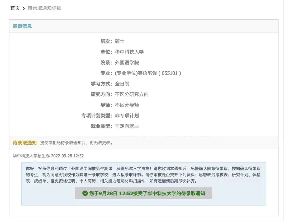 功夫不负有心人,今年九月,陈颖衡拿到了华中科技大学、北京外国语大学、上海外国语大学等15所高校的offer,以推免第一的成绩保研至华中科技大学。三年勤勤恳恳的学习,无数次与时间赛跑的奋斗,终于在那一刻有了回响。