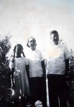 吴定良(左三)与夫人史久庄(左二)、小女吴小庄(左一)在自家花园留影