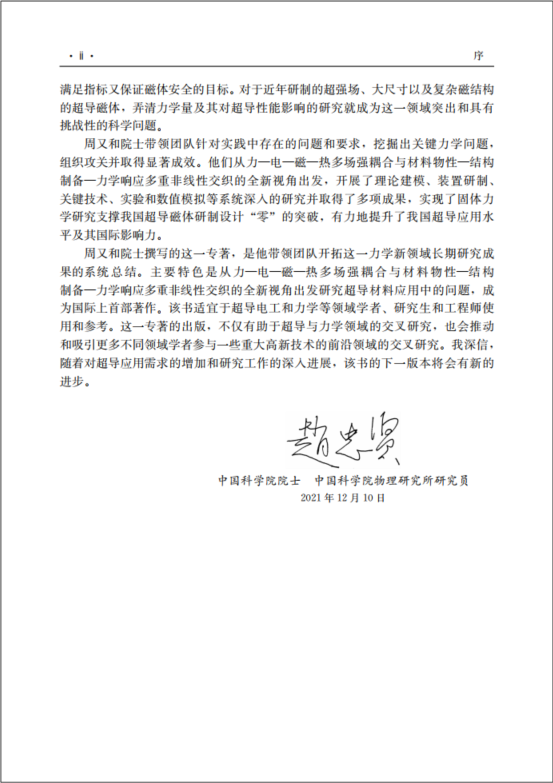 该专著由我国著名超导科学家、国家最高科技奖获得者赵忠贤院士作序,肯定上述成果“有力地提升了我国超导应用水平及其国际影响力”“成为国际上相关领域的首部著作”。与此同时,该专著在选题出版过程中,还得到了胡海岩院士、郭万林院士和王秋良院士的推荐,经科学出版社组织申报获国家科学技术学术著作出版基金资助。