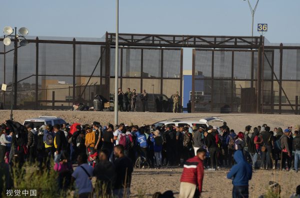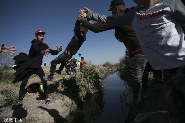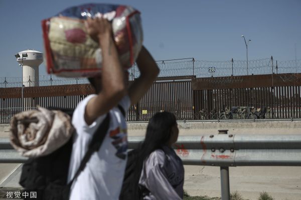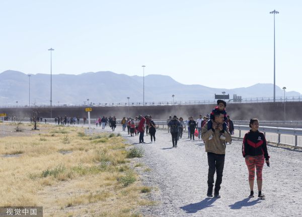 当地时间2023年3月29日,墨西哥华雷斯,移民们沿着美墨边境行走。此前一处移民拘留中心发生火灾,造成数十名移民死亡。