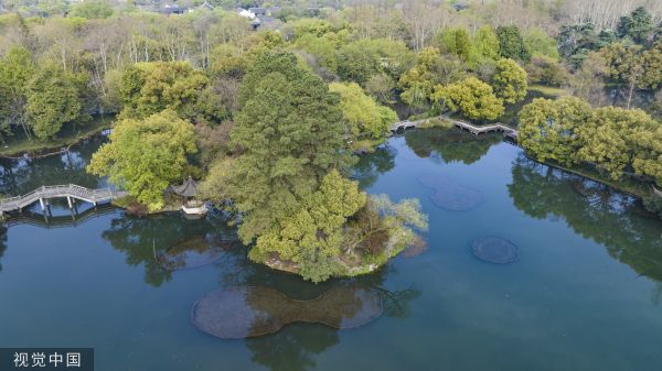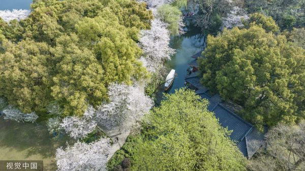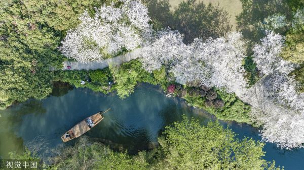 2023年3月26日,杭州,西湖曲院风荷风景区内,樱花盛开春色如画。游客泛舟湖上,怡然自得。
