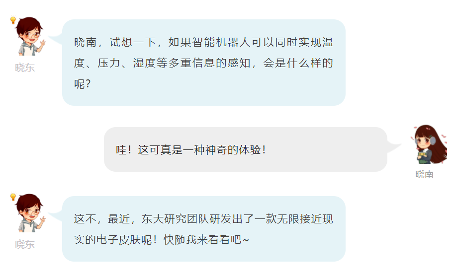 “电子皮肤包括两层含义,首先它要具备皮肤一样的特征,形态柔软、可拉伸等,同时也具备皮肤一样的功能,能够感知到温度、压力等。”吴俊介绍,目前的电子皮肤研发面临两大挑战,一是如何提升单个器件性能的稳定性,二是如何将多种信息进行集成耦合。通常这类工作仅覆盖皮肤的两种或三种属性,距离实现皮肤般丰富的刺激感知感官和理化特性还有很大差距。如果实现对人类皮肤的多样物理-化学和感官特性的高效重现,则将会成为人机界面复杂多功能仿生应用的核心技术与下一代电子皮肤的革新型成果。