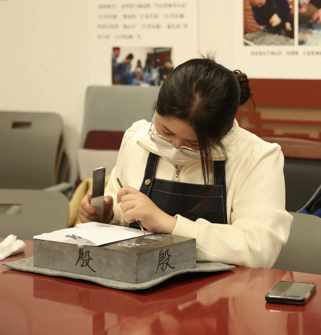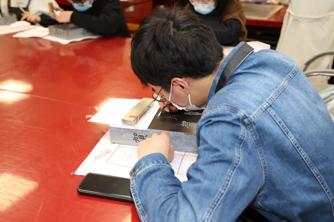 上学期,他选修了面向本科生的“中国传统书籍装帧艺术与实践”,对石刻产生了浓厚兴趣。这学期,又特别咨询了古保院老师能旁听的篆刻课程。他坦言,自己平时会刻些小石头,大石块刻起来感觉很不一样,“低头刻一会就脖子酸痛。”