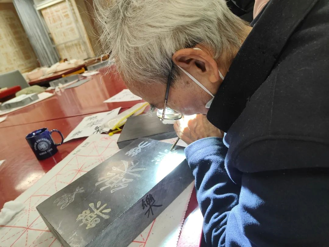 学艺时,赵嘉福常揣摩师傅的手法和技巧,一直练到旁人听不出他和师父刻碑声音的区别,才算可以。但他并不要求学生走刀、转折和自己一模一样,“只要能做好就行,有创新意识更好。大学是教基础知识,到具体工作岗位,这些是敲门砖。”