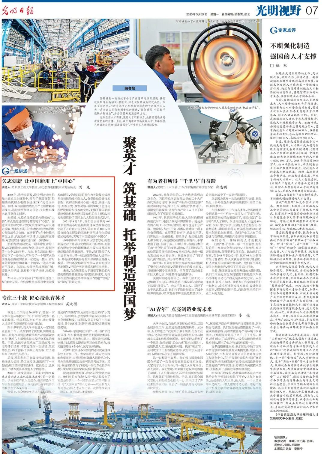 3月27日,《光明日报》第7版“光明视野”《聚英才 筑基础 推举制造强国梦》专稿以《矢志创新,让中国船用上“中国心”》为题,刊载哈尔滨工程大学教授、动力装置电控技术研究所所长刘龙讲述自己和团队紧扣国家重大需求,坐稳基础研究“冷板凳”、扑下身子钻研技术创新,支撑制造业高质量发展,让中国船舶用上“中国心”的奋进历程。