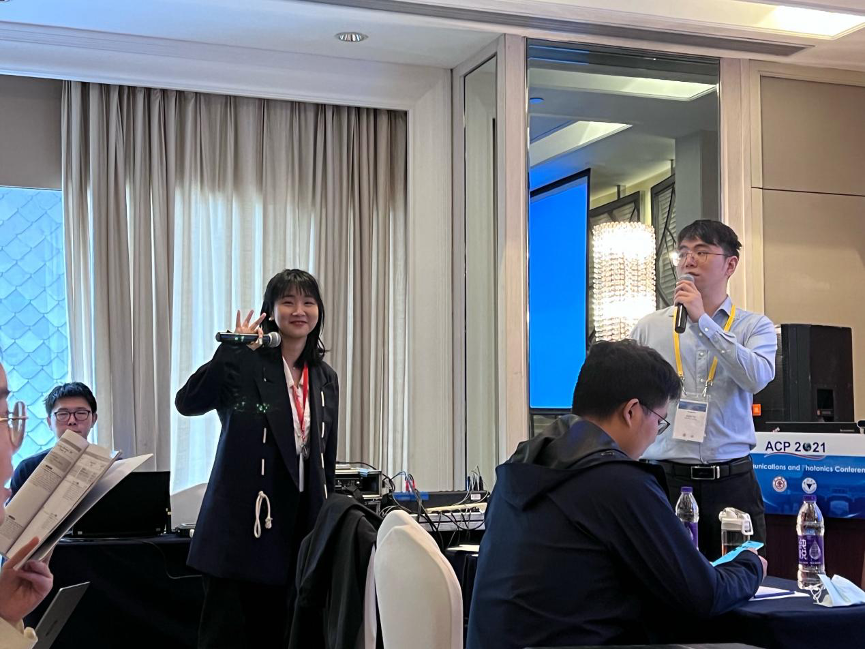 2022-2023年,陈心羽在A类SCI期刊上发表研究论文4篇,并成功申请到一项专利——一种基于神经网络的时频二阶均衡方法及通信系统。在这项专利中,她提供了一种具有更高均衡性能的时频二阶均衡方法,减少了计算噪声和传输失真的影响。2021年光电子与通信国际会议(OECC)和亚洲通信与光子学国际会议(ACP)上,陈心羽共发表了3篇会议论文并做口头报告。其中两篇以第一作者身份发表的Post-deadline论文,代表了该工作在相关领域的领先水平。另一篇以共同第一作者身份发表的论文获得了“最佳学生论文奖”。