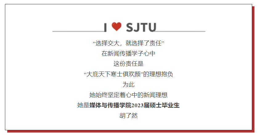 新闻学本科毕业,胡了然以全系第一名的成绩顺利保研到交大媒传学院新闻传播学专业。在交大开放包容的氛围中,在媒传学院国际化的培养下,她更加深刻地理解了“国际新闻”的内涵。“当前我们的国际舞台中,太需要更多讲好中国故事,提升中国国际话语体系的声音了。”授课老师的这句话,印在了胡了然的脑海里。在那一天,她下定决心备考中央媒体,立志投身新闻宣传事业。