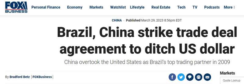 据福克斯商业频道(Fox Business)29日晚消息,巴西已与中国达成协议,不再使用美元作为中间货币,而是以本币进行贸易。