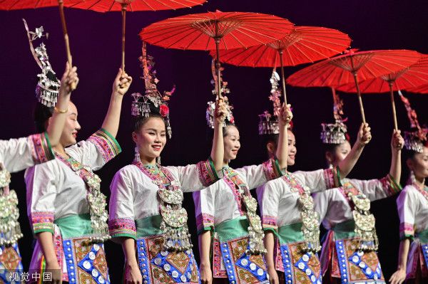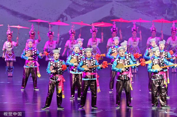 2023年3月30日,广东省佛山市,来自贵州省黔东南苗族侗族自治州从江县民族艺术团的演员在南海区表演歌伴舞《小黄姑娘》。当日,以“听音湖‘享’养心圣地•湾区游客‘探’神秘从江”为主题的贵州省黔东南苗族侗族自治州从江县文旅宣传推广暨招商推介系列活动在广东省佛山市南海区举行。“寻神秘之乡•跟我去从江”原生态民族文化展演,为南海区观众带来极具苗侗风情民族特色的歌舞表演。