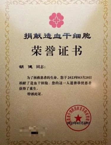 3月20日,重庆大学土木工程学院博士生党员胡健,在重庆医科大学附属第一医院顺利完成造血干细胞捐献采集,为湖南一位3岁的血液病患儿进行了一场生命的接力,成为重庆市第219位造血干细胞捐献者。重庆市红十字会捐赠管理中心向其赠与了由中华骨髓库颁发的荣誉证书。