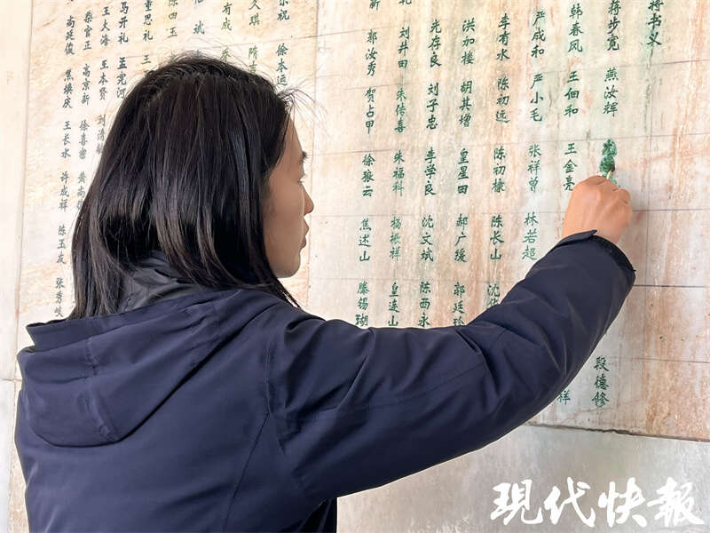 今年是太爷爷牺牲75周年,尤婷婷得知淮海战役烈士纪念塔园区内有一面“英烈墙”,便想携家人前去祭奠,却被工作人员告知馆藏烈士名录里没有这个名字。尤家人第一时间联系到如皋市退役军人事务局寻求帮助。因年代久远,相关历史档案查证有些难度,但如皋市退役军人事务局高度重视,专门成立查证小组,多方寻找,最终在当地查找到了一份尤学礼烈士证的复印件。如皋市退役军人事务局随即与淮海战役烈士纪念塔管理中心取得联系,递交了补刻名字必须的档案及材料。